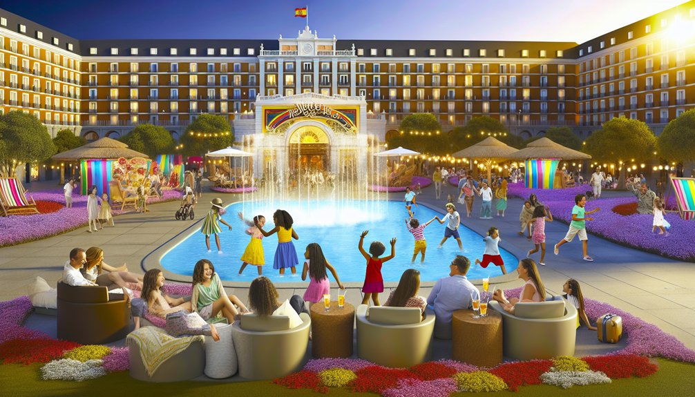 You’ll find amenities like kid-friendly pools, play areas, children’s menus, babysitting services, and organized activities. Many hotels also offer family suites, cribs, and special programs to guarantee your kids have a fun, safe experience.