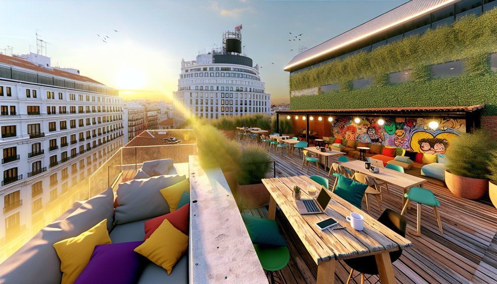 Room007 is a standout, providing dedicated work areas that guarantee you stay focused and productive. If you’re after a vibrant social atmosphere, OK Hostel Madrid boasts ample coworking spaces, perfect for connecting with fellow travelers.